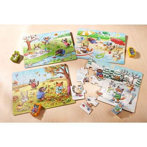Um ano inteiro de diversão! Seja primavera, verão, outono ou inverno, os pequenos fãs de puzzles ficarão emocionados. A caixa é composta por quatro puzzles com vários motivos coloridos e quatro figuras de madeira para brincadeiras criativas. Contém 4 puzzles com 15 peças.
