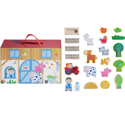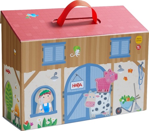 Uma mala de cartão que se desdobra e se transforma em casa e traz muitos animais e acessórios. Óptimo para brincadeiras livres e levar para todo o lado mas inclui também um conjunto de regras para os pais jogarem com os filhos, desenvolvendo assim a sua linguagem e capacidade de observação (exemplo: contar uma história e as crianças têm que acompanhar com as figuras). A Quinta é um sucesso para filhos e pais! Com 22 peças de madeira e 1 mala quinta.