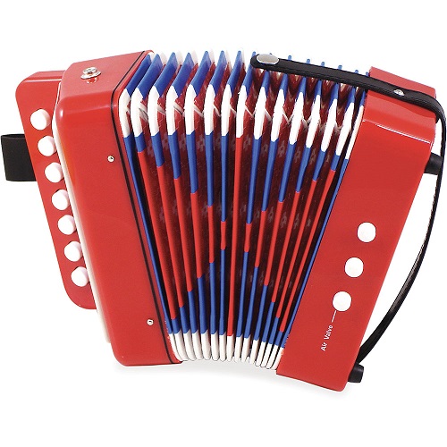 Acordão para criança com 10 tclas e 14 tons. Um acordeão muito bonito em pvc azul, branco e vermelho para apresentar ao seu filho os prazeres da música.