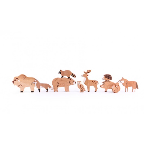 O conjunto contém: lobo, raposa, coruja, guaxinim, veado, urso, bisonte, javali, esquilo, ouriço.