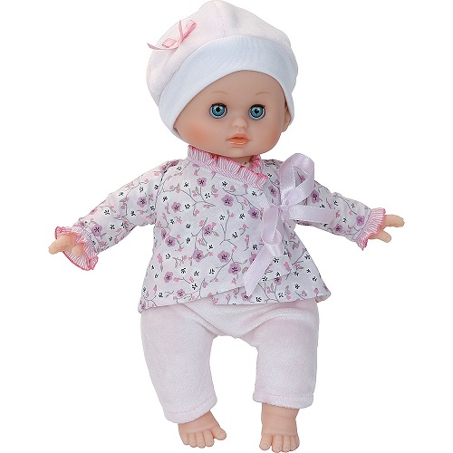 Bebé de 28 cm com forro "Bonbon Rose". Cabeça, braços e pernas em vinil macio com um delicado perfume de baunilha. Corpo em tecido. Olhos azuis. Cabelo castanho pintado. Fabricação europeia. Lavável à máquina.