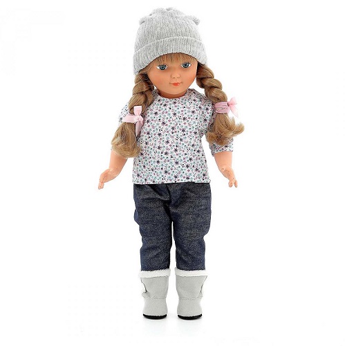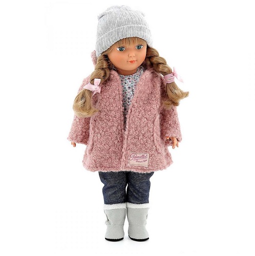 Boneca Francette 40 cm com vestido "Inverno". Corpo e membros em polietileno. Cabeça de vinil macio. Olhos azuis fixos com cílios. Cabelo loiro comprido com tranças. A sua roupa consiste em calças de ganga e uma camisa floral, um casaco rosa grosso e um gorro cinza, além de botas cinza. Edição numerada.