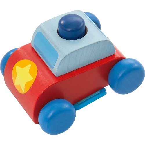 Para manter os bebés entretidos quando se passeia de carrinho, esta roca com pulseira de velcro prende-se bem ao braço do carrinho! Um carro de madeira bem colorido, com botão que apita.