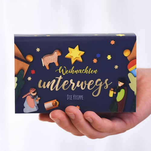 Na caixa deslizante decorativa, gravada a ouro, no estilo de uma caixa de fósforos, o presépio pode ser facilmente montado em qualquer lugar. Requer um pouco de perícia para colocar as pequenas figuras no lugar certo e configurar a cena do presépio. Poderá colocar as figuras e elementos de acordo com o seu gosto de várias maneiras. E muito rapidamente, quando podemos estar 'na estrada' novamente, o presépio está guardado e pronto para o seu próximo lugar.