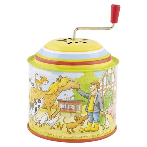Uma caixa de música de metal de alta qualidade precisa de três coisas: uma melodia familiar, cativante e agradável para crianças; uma ilustração carinhosa e harmoniosa; e uma manivela que uma criança entusiasmada gire. "Old McDonald had a farm" ("O Velho McDonald tinha uma quinta") – esta melodia atemporal soa simplesmente girando a manivela. O ilustrador capturou o tema com maestria na caixa de música de metal. Ouvir e ver se fundem em um deleite completo.