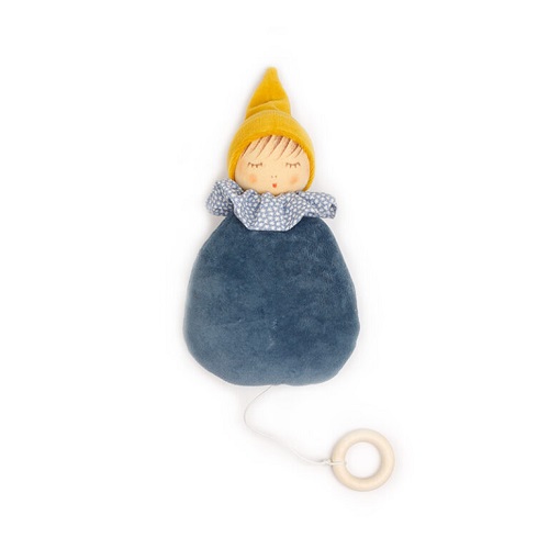 Uma caixa de música que é também um boneco querido e fofo para os bebés brincarem e dormirem com ele. Com diferentes texturas, basta puxar a argola de madeira no fundo para ouvir a música tocar. Caixa de música confeccionada em algodão orgânico (kbA), preenchida com 100% lã de ovelha Biológica (kbT). Ideal para acompanhar o bebé enquanto adormece, com uma suave música. O Bonequinho sai da caixa de música.