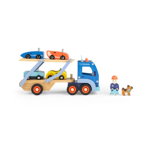 Graças ao motorista e ao seu cachorrinho, os 4 lindos carrinhos chegarão em segurança a bordo deste magnífico camião de madeira! Horas de diversão garantidas.