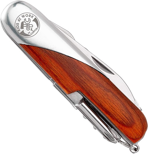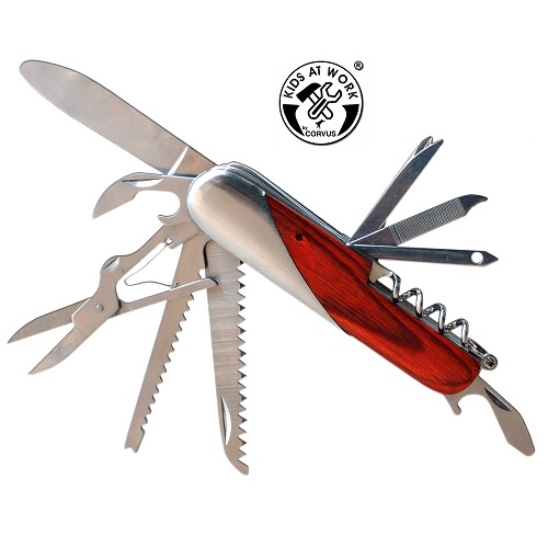 Canivete com 14 funções. Seja para fazer trabalhos manuais ou várias atividades ao ar livre e na floresta: o canivete CORVUS é o companheiro ideal para jovens trabalhadores e exploradores. Com seu formato compacto, cabe perfeitamente em qualquer bolso das calças e pode ser facilmente transportado para qualquer lugar.