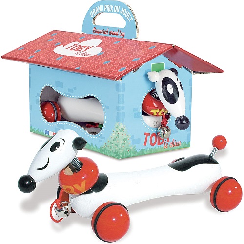 Este poderá ser o fiel amigo do seu filho. Toby vem numa caixae m forma de casota de cão, é feito em madeira e as rodas têm um fio de borracha para proteger o chão e não fazer ruido ao andar. Com acabamentos de alta qualidade e pormenores deliciosos, entre eles um guizo ao pescoço.