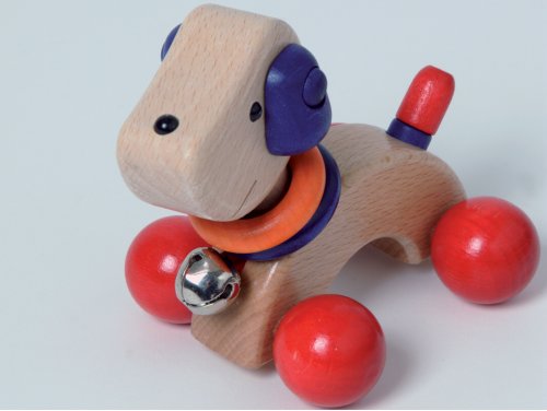 Cãozinho em madeira com rodas e um gizo ao pescoço.
