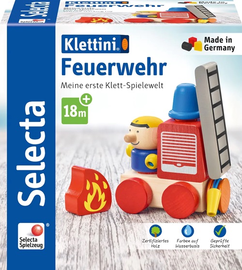 Constrói o carro de bombeiros dos teus sonhos: isso estimula as fantasias das crianças e garante diversão. Com a figura de brinquedo adicional, as crianças podem mergulhar no novo mundo dos jogos Selecta® (Velcro). Os Klettinis® são feitos para mãos pequenas e são compatíveis com outros conjuntos de velcro Selecta® para construção criativa. Conteúdo: Chassi com 4 rodas, Bloco com mangueira com ponteira, sirene, carrinho de equipamentos, escada, chama e bombeiro