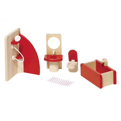 Mobilia de casa de banho em madeira para casa de bonecas. Contém 5 peças.