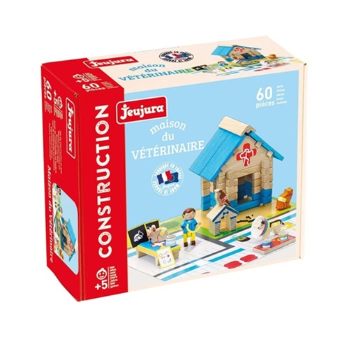 A Casa do Veterinário: jogo de construção com 60 peças em madeira natural e tingida com instruções de montagem, um tapete de brincar e muitos acessórios, numa caixa de armazenamento muito prática.