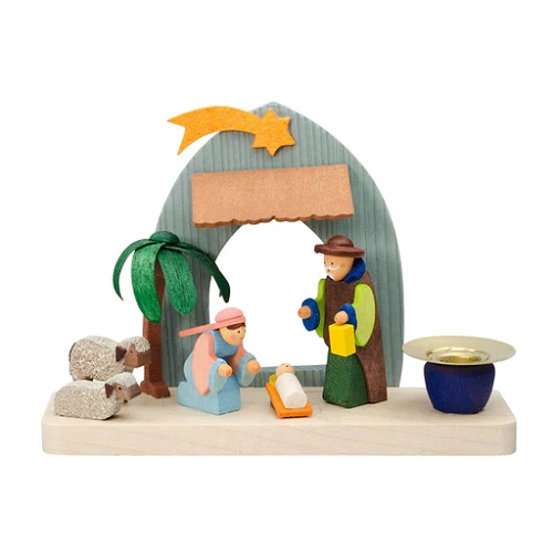 A cena da Sagrada Família é um dos motivos mais tradicionais da arte popular em Erzgebirge. Aqui foi reintrepretado num novo design e ainda de maneira clássica neste castiçal. Todas as figuras e animais são pintados à mão.