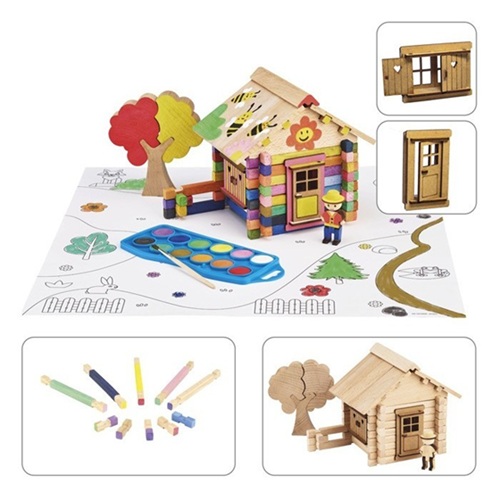 Chalet para Pintar - 85 peças:  Jogo de construção em madeira natural para pintar e decorar de acordo com a tua imaginação, com tapete de brincar, personagem, árvore, instruções de montagem e paleta de tinta, em uma caixa muito prática.