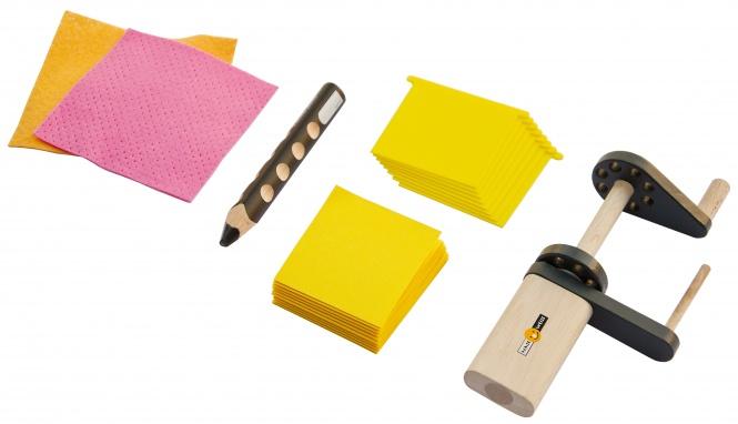 Contéudo: 1 cinema de manivela, 8 cartões para imagens, um lápis solúvel na água, 2 panos de esponja e 24 autocolantes.