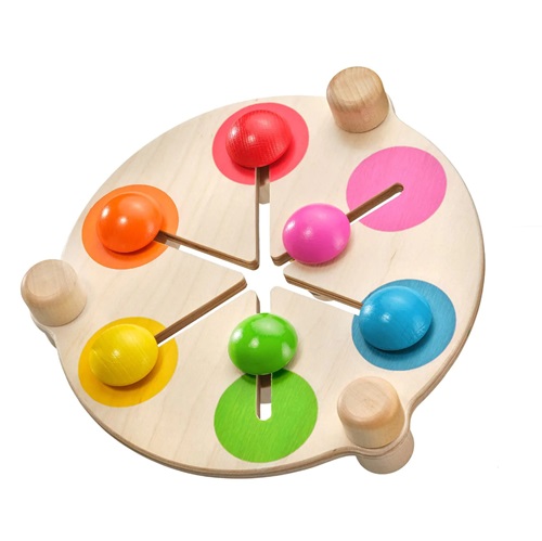 O objetivo é posicionar os botões coloridos de forma que correspondam às marcações coloridas do disco. Feito! Depois continuamos com as formas do outro lado - porque tudo mudou aqui! A habilidade de reconhecer e atribuir cores e formas é treinada de forma lúdica.