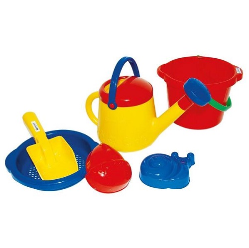 Com tém 6 artigos: 1 balde, 1 pá, 2 formas, 1 regador e 1 peneira