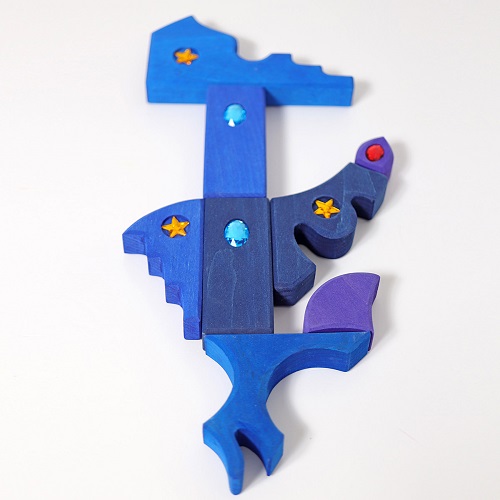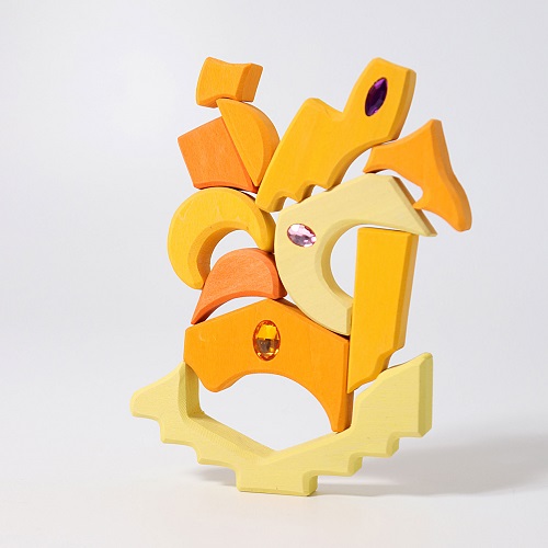 Com as formas orgânicas e inspiradas no Oriente, cenas, cidades e paisagens cintilantes podem ser construídas. A variedade única de formas inspira as crianças a construir novas cenas de jogo todas as vezes. Este conjunto de construção é um complemento perfeito para o puzzle criativo paisagem (art. 43500) e o conjunto de construção de quatro elementos pequenos (art. 10217). Com este conjunto as crianças são capazes de desenvolver a motricidade fina, bem como as habilidades de raciocínio lógico e espacial. Contém 52 peças em madeira com pedras de brilho acrílico.