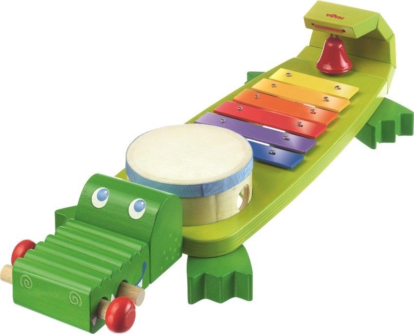 Que crocodilo tão divertido! Este crocodilo tem 4 instrumentos musicais incluídos! Um reco-reco, um tambor, um xilofone e um sino, com 2 baquetas para fazer música. Brinquedo que irá estimular os pequenos músicos a aprender música com sons agradáveis e afinados.