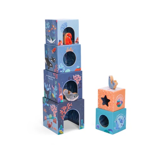 Seis cubos empilháveis ​​com três personagens de madeira convidam o bebé a brincar no fundo do mar. Os seus rostinhos lindamente ilustrados oferecem diferentes oportunidades de aprendizagem divertida, dependendo da idade: construir uma torre, aprender a contar, descobrir animais marinhos…