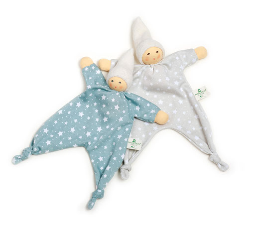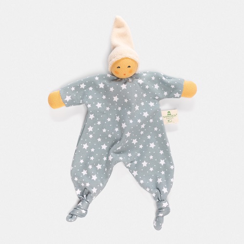 Doudou confeccionado em algodão orgânico (kbA), preenchida com 100% lã de ovelha Biológica (kbT). Ideal para acompanhar o bebé enquanto dorme, ganhando os cheiros familiares do bebé, passando uma sensação de segurança e com os nós na zona dos pés é ideal para morderem para aliviar as gengivas no altura do nascimento dos primeiros dentes.