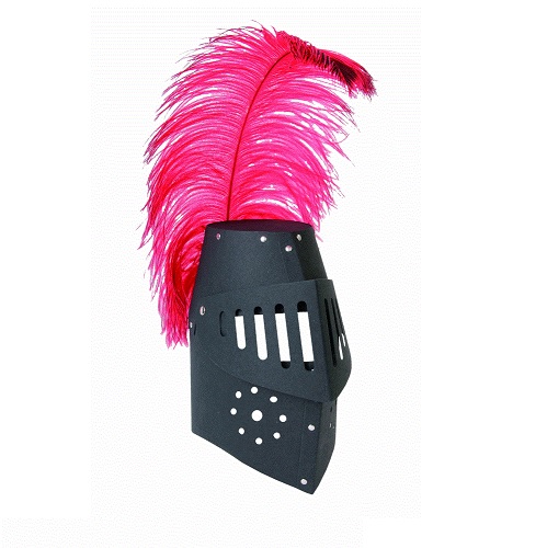Capacete de cavaleiro em cartão resistente com pena colorida. A viseira abre e fecha para prteger a face do cavaleiro. A pena poderá não ser da cor da imagem (cor aleatória).