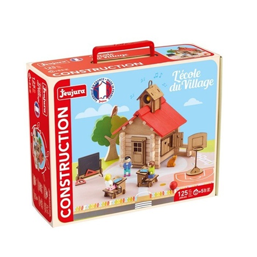 A Escola da Vila - 125 peças: Conjunto de construção em madeira natural e tingida com instruções de montagem, um tapete de brincar e muitos acessórios, numa caixa de armazenamento muito prática.