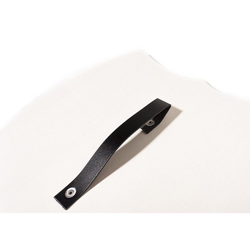 Escudo em madeira com uma coroa pintada. Com pega atrás em pele reciclada.