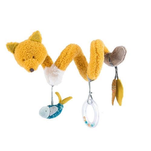 Espiral de atividades para bebé, da coleção Le Voyage D'Olga, em pelo macio cor de mostarda, com espelho, roca e folhas crepitantes que fazem barulho tudo preso ao corpo da raposa. Ideal para ajudar a estimular os sentidos do bebé.