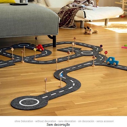 Agora vais poder fazer a tua própria cidade, com esta estrada em feltro poderás fazer diversos percursos, pois as peças encaixam-se umas nas outras. Contém 28 peças de trada em feltro e 2 carrinhos em madeira.