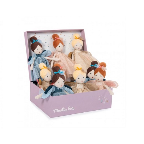 Esta adorável bonequinha de fada está a usar um lindo vestido rosa com manchas douradas cobertas por uma rede de ouro brilhante com asas nas costas. A sua roupa é completada com escarpins macios e um laço de rede rosa no cabelo. Com os seus pequenos quadradinhos rosados ​​e sardas, esta boneca Moulin Roty é realmente especial.
