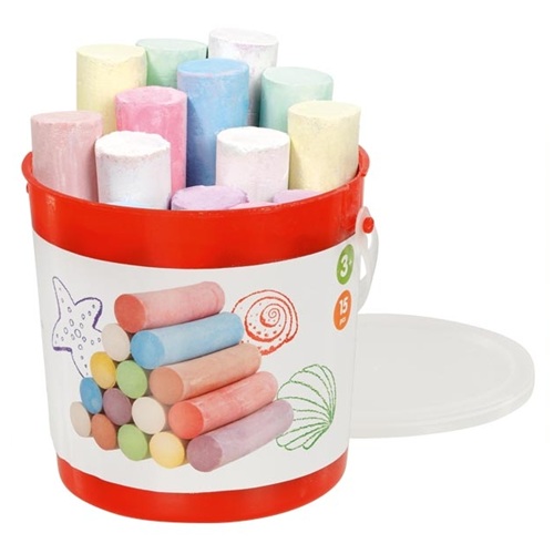 15 bastões de giz num prático balde para transporte. Com 2,5 cm de diâmetro, são ideais até para as mãos dos artistas mais pequenos.
