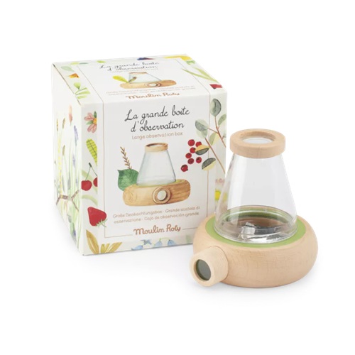 Com dois ângulos de visão e zoom de 4x, a grande caixa de observação ajudará a descobrires os mínimos detalhes das folhas, flores e todos os outros tesouros do jardim. Ela abre-se pela parte superior para observar e compreender os hábitos dos seres vivos.