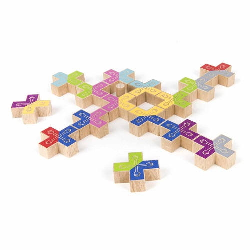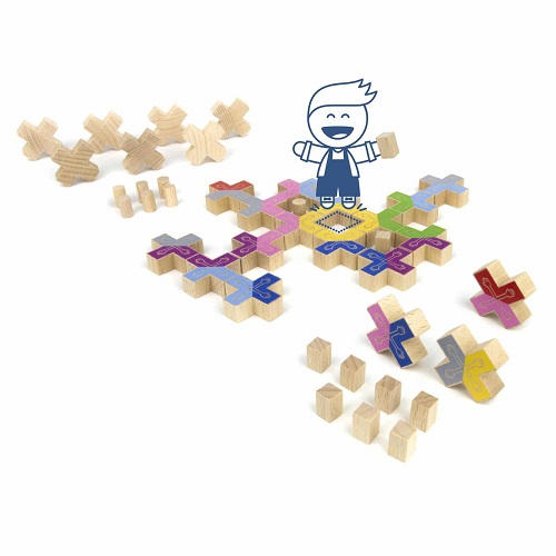 28 peças de madeira de duas cores e 18 marcadores (9 paralelepípedos e 9 cilindros) em madeira de faia