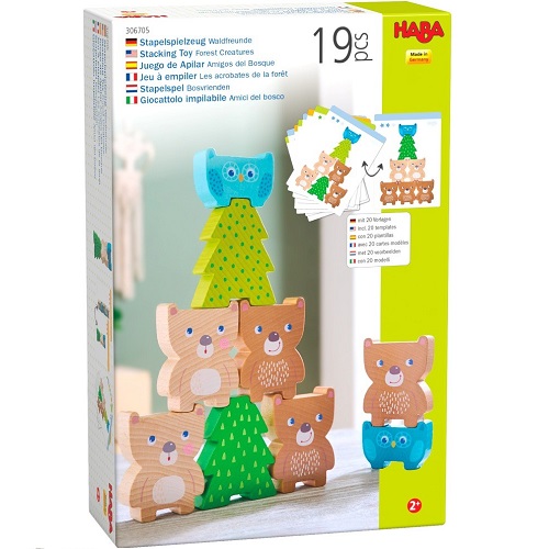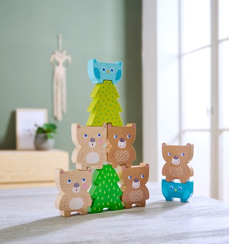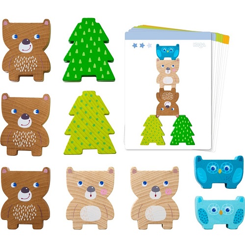 Um jogo de equilíbrio para ser jogado de forma livre ou seguindo as cartas template. As crianças podem empilhar os ursos e os pinheiros como quiserem, treinando assim a sua motricidade, mas podem também fazer as sugestões dadas pelas cartas template, com vários níveis de dificuldade, desenvolvendo assim a noção espacial e tridimensional, o reconhecimento de formas e de cores, bem como a paciência. Um jogo com 9 peças de madeira e 10 cartas com sugestões com frente e verso.