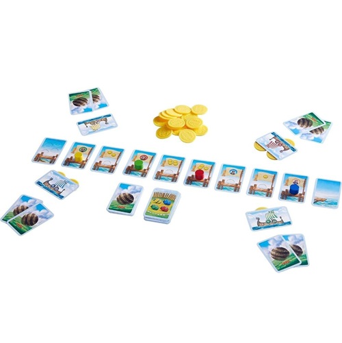 Um prático mini jogo de lata, ideal para levar e jogar em qualquer lugar. Quem conseguirá posicionar-se melhor no cais, movendo barris, e assim ganhar mais moedas de ouro? Jogo de estratégia para 2 a 4 jogadores a partir dos 6 anos. Regras em português no interior