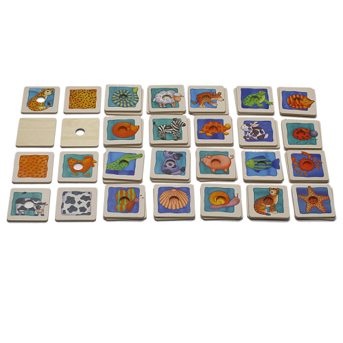 Jogo de memória em madeira. Com este jogo vais ter que relacionar o cartão animal com o cartão do padrão da sua pele. Contém 48 peças.