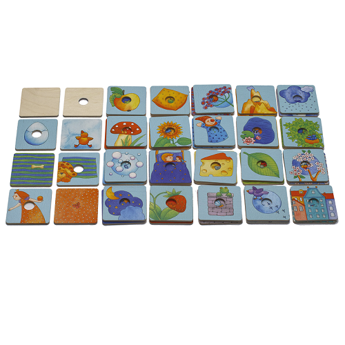 Jogo de memória em madeira. Com este jogo vais ter que relacionar o cartão imagem com o cartão cor/pormenor relacionado com o cartão imagem, tornando este jogo de memória mais complexo do que os tradicionais jogos de memória com imagens a duplicar. Contém 48 peças.