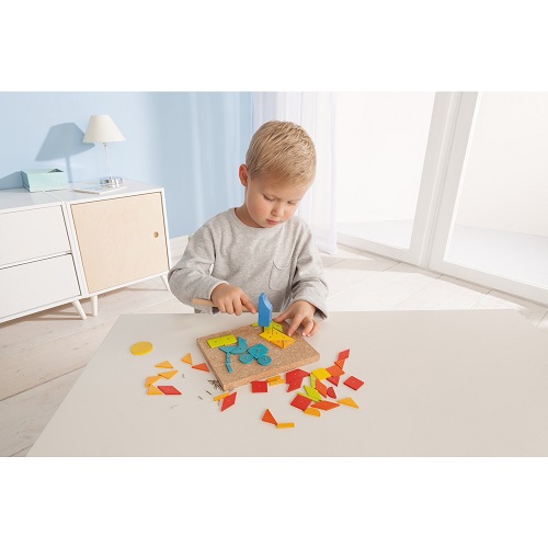 Jogo educativo de pregar com peças geométricas de várias cores, para criar cenários a partir de peças abstractas, treinando assim de forma divertida a motricidade fina, a destreza, a atenção e a imaginação, mas também o sentido de responsabilidade! Inclui 1 placa de cortiça com 22x22cm, 50 peças de madeira, 1 martelo de madeira e pregos. Brinquedo educativo para ser usado sempre sob a supervisão de um adulto!