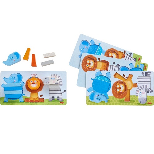 Um jogo educativo para encaixar as peças nas bases e construir os animais da selva. Neste safari as crianças vão descobrir o elefante, a zebra e o leão e compor os seus corpos de formas diferentes consoante o cartão, ou dar largas à imaginação e criar os seus próprios animais, deitados ou empilhados! Jogo educativo com 12 peças de madeira e 4 bases de cartão.