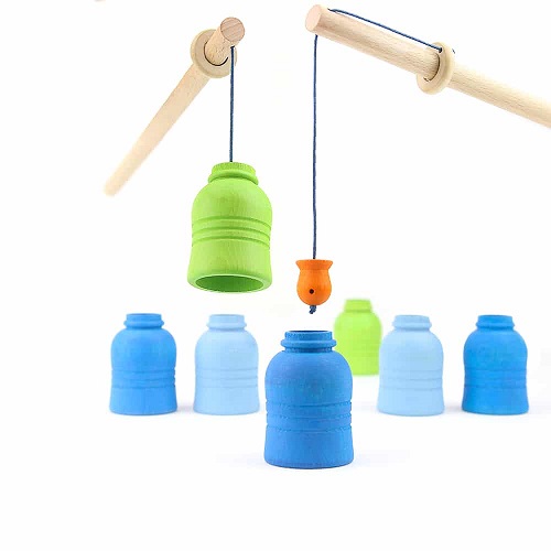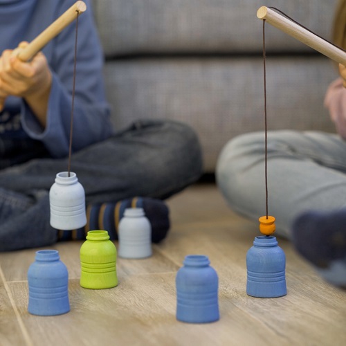 Escolhe o nível de dificuldade alterando o comprimento da linha. Engancha a garrafa com o peixinho de madeira e levanta-a deslizando o anel na haste. O vencedor é o jogador que conseguir mais garrafas de madeira antes do outro jogador!