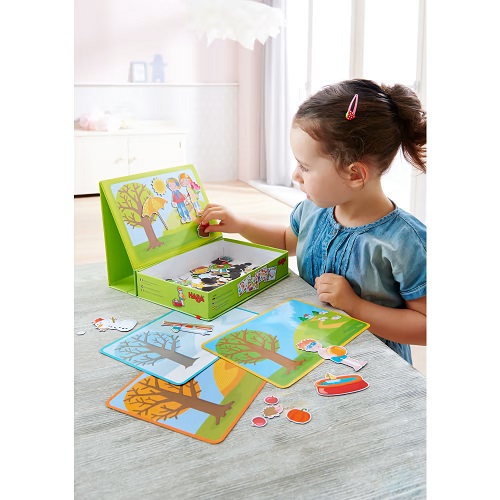 Ideal para viajar, de carro, avião ou comboio, esta mala de cartão está repleta de figurinhas para as crianças aprenderem as 4 estações do ano! Com 4 cenários das 4 estações, as crianças podem usar as 90 peças magnéticas para brincar e inventar histórias. No final as peças ficam guardadas na mala!