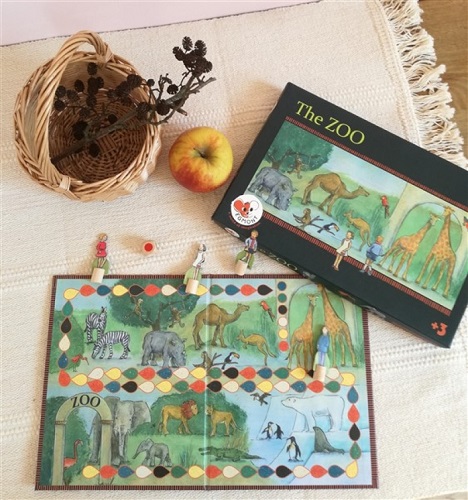 Um primeiro jogo de sociedade para os mais pequenos. Cada peão avança de acordo com as cores dos dados e visita os animais do zoológico. É um jogo com um visual vintage, ótimo para aprender as cores e… para aprender a esperar a sua vez de jogar. Instruções em Português.