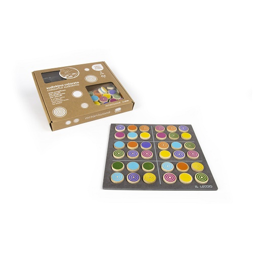 Sudokino Colorido é um jogo em madeira com desenho contemporâneo de um dos mais populares jogos de lógica Sudoku é um desafio para toda a família: diverte as crianças pelas cores, grades e esquemas simplificados e agrada os adultos que brincam com os esquemas mais difíceis.
