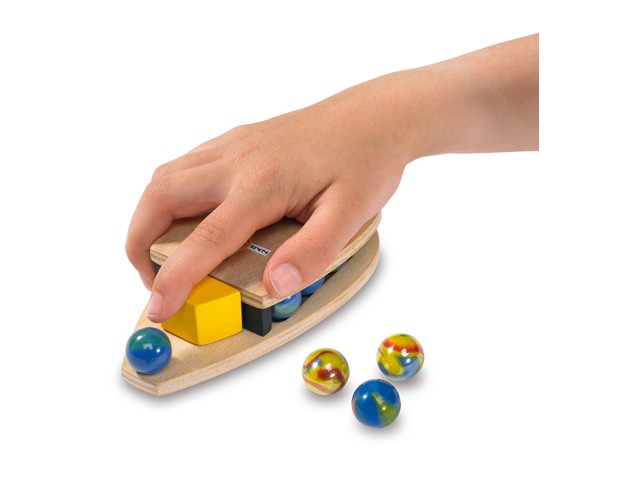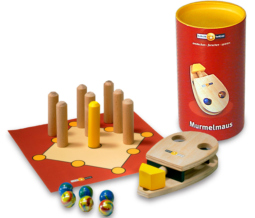 Contéudo: 1 lançador de berlindes, seis berlindes de vidro, nove pinos e um tabuleiro.