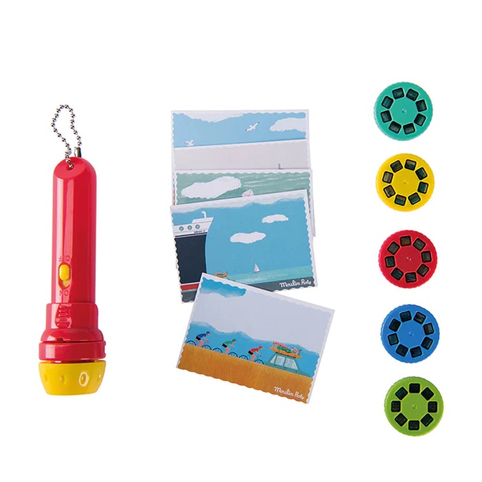 Caixa com tela de projeção, bem ilustrada! Desenhado como um livro, contém uma lanterna para projetar, 5 discos e 5 postais, com o tema Pequenas Aventuras. Permite que as crianças inventemas  suas próprias aventuras e criem memórias cheias de imaginação e momentos divertidos juntos que elas valorizarão.