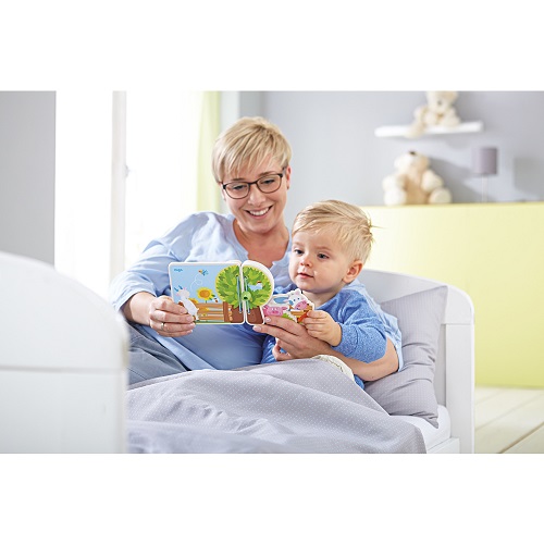 Este livro de madeira leva as crinaças para o reino dos animais da quinta. As páginas de madeira estão presas por um fio e são fáceis de virar e de agarrar.