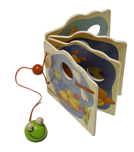 Livro em madeira com um sapo que poderá ser encaixado em cada uma das páginas.