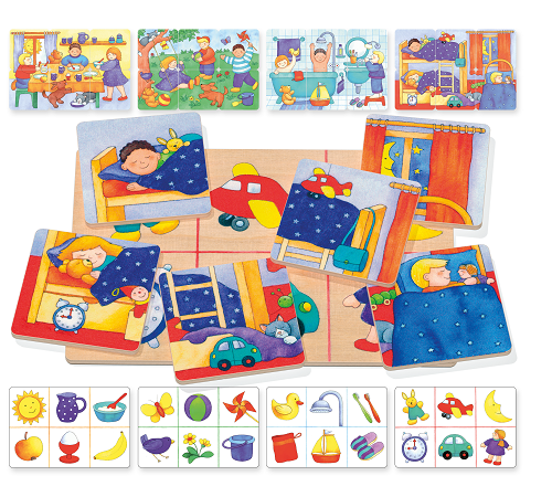 Este divertido jogo em totalmente em madeira é uma mistura de Loto e Puzzle. A criança terá de completar o seu cartão com as peças adequadas, no final irá ter uma imagem com uma das fases do dia. Contém 4 tabuleiros das fases do dia. Regras em Português incluídas.